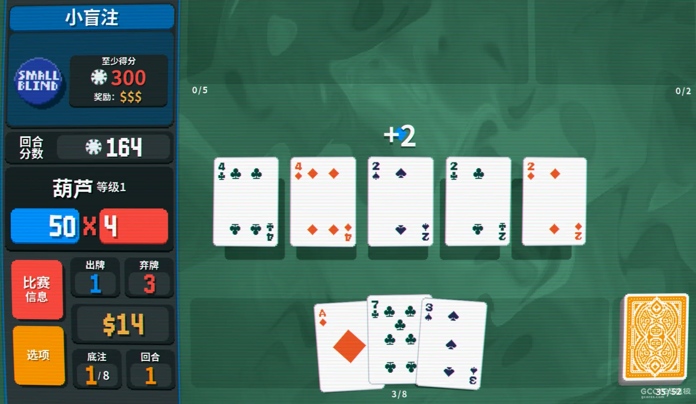 Basic scoring rules for clown cards:Each time a card is played, the player can choose 1-5 cards to play, which is calculated according to the base points and multipliers of the system card type:First, the cards in the valid scoreboard type will be applied in turn, adding to their own points based on the combination points, then the additional effect of that card will be determined, and then the next valid scoreboard will be determinedValid scoreboard, that is, in a valid combination of cards, such as playing 4 4 3 3 2, two pairs of 4 and 3 are valid, single 2 will not participate in the settlementThen, if the Joker card above has a valid type, multiplier, points, or economy are addedAfter the addition is completed, the score is calculated according to the final points and multipliers, and the round score is added togetherWhen a card is played or folded, an equal amount of cards are drawn from the library and added to the handIf the discard is exhausted or the round score is greater than or equal to the blind score, the parlay is passed, and if the discard is used up and the score is not reached, the round of rouge ends